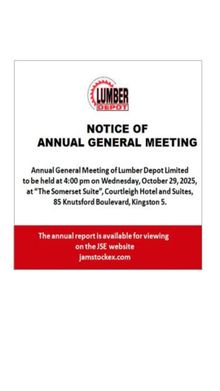 The Annual General Meeting of Lumber Depot Limited will be held on Wednesday, October 29, 2025 at 4 p.m. at the Somerset Suite of the Courtleigh Hotel and Suites located at 85 Knutsford Boulevard, Kingston 5